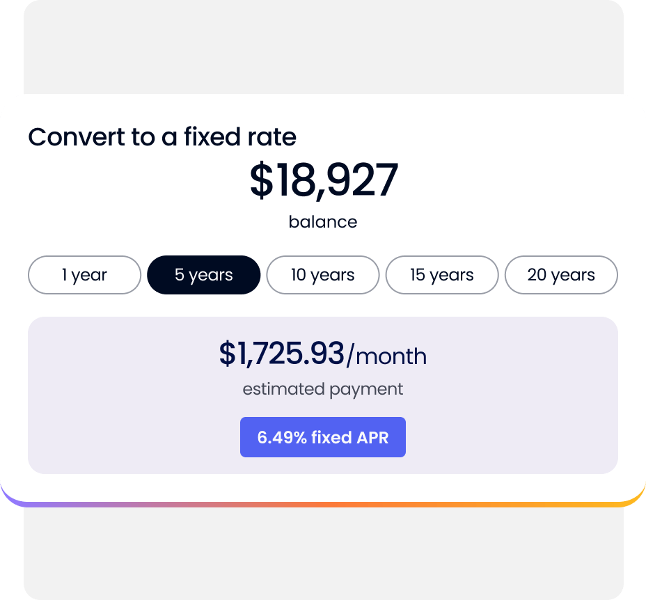 The Trovy HELOC starts with a variable rate, but offers you the best of both worlds. You can convert all or part of your balance to a fixed rate, locking in predictable monthly payments for that portion while keeping the flexibility of variable-rate borrowing on your remaining balance. This gives you control over your payment structure as your needs change. You can convert all or a portion of your outstanding HELOC balance at the end of any calendar month, or the full amount of specific purchases, cash advances, or balance transfers.